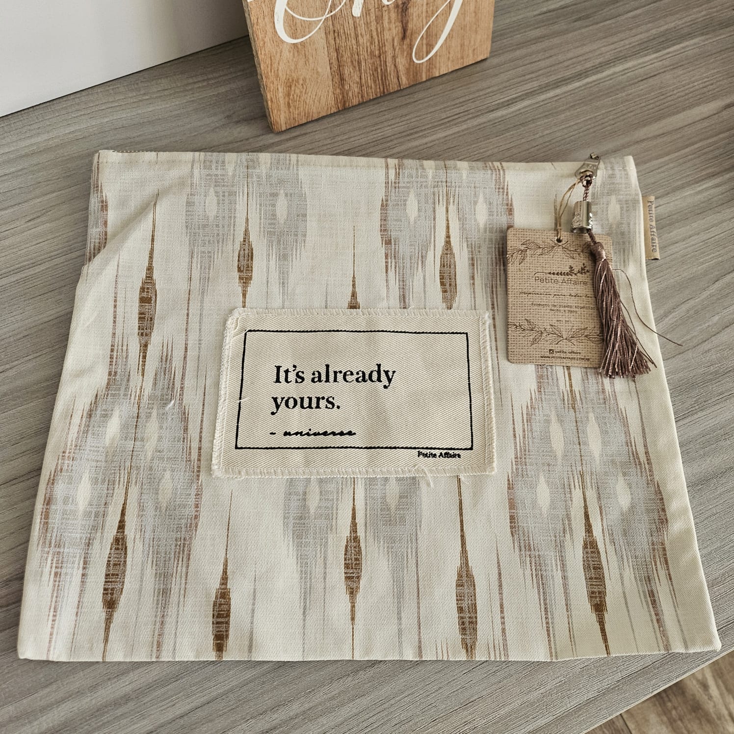 Práctico sobre para el guardado de diversos ítems, confeccionado con nuestra gabardina exclusiva “Folk”. Cuenta con detalles como aplique en lona serigrafiada, cierre metálico y terminación con borla en el tiracierre.