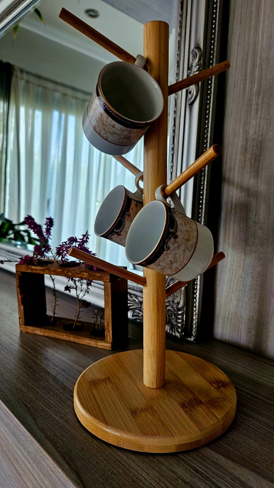 Práctico organizador de tazas de bambú. Con capacidad para colgar hasta 6 unidades. Medida aprox. 36 cm de alto.