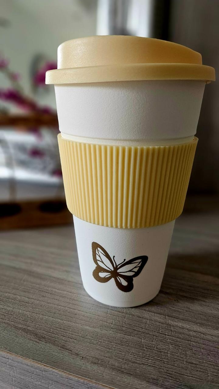 Vaso con tapa de 14 cm de alto x 8 cm de ancho. Capacidad 350 cc. Mariposa serigrafiada. Apto para microondas sin banda de silicona y sin tapa.
